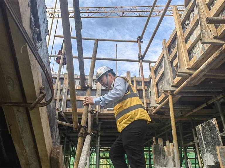 来到3楼顶板上方,工人们正搭建防护网。“他们是这个工作面的开荒者,危险系数最大。”叶刘杰说,只有防护网搭建完毕,木工、钢筋工等不同班组才能陆续入场施工。仔细查看每道工序,并对当班工人叮嘱一番注意事项后,叶刘杰才放心离开。